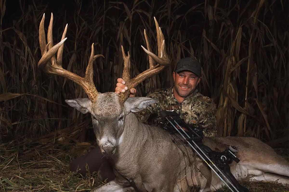 “There was a scrape line in there and standing corn nearby. Being so short of time I decided to hunt all day”, he adds. “Then on my first sit a true giant came in and bedded down only 30 yards away.” It appeared his plan was about to pay off, but someone came by mid-morning and bumped the buck.